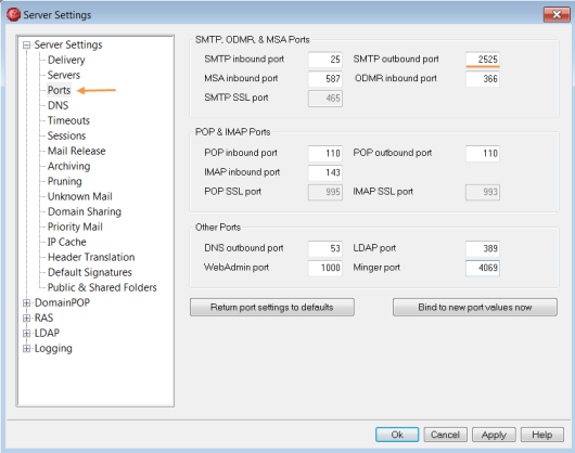 Step 3Select Ports under Server Settings. Change the SMTP outbound port to 2525. Our Mail Relay service is also open on ports 25, 26, 80, 940, 587, 8001. Click Apply and OK buttons to save your settings. |