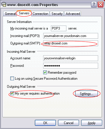 4. In the new window select the Servers tab change Outgoing mail (SMTP) to relay.dnsexit.com and check My server requires authentication
