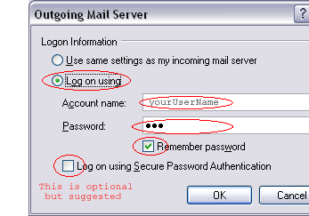 5. Click on Settings button to bring up Outgoing Mail Server Account setup window. Check on Log on using and enter your account login name and password. Check the Remember password so that you won't be asked for login again. The Log on using Secure Password Authentication is optional but suggested.