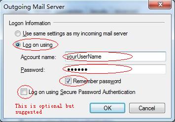 5. Click on Settings button to bring up Outgoing Mail Server Accout setup window. Check on Log on using and enter your account login name and password. Check the Remember password so thay you won't be asked for login repeatly. The Log on using Secure Password Authentication is optional but suggested.